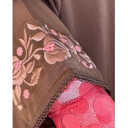 Cette jellaba taupe est confectionnée dans un coton satiné de qualité supérieure, doux au toucher et agréable à porter. Sa coupe droite est rehaussée d’une broderie florale multicolore réalisée à la main, qui orne le col, la poitrine, les poignets et le bas du buste avec finesse et subtilité.