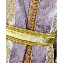 Ce caftan long en velours mêle élégance et tradition grâce à son tissu luxueux aux reflets violacés et ses motifs dorés en relief. Sa coupe droite et fluide est sublimée par une ceinture dorée qui marque délicatement la taille, mettant en valeur la silhouette avec raffinement.