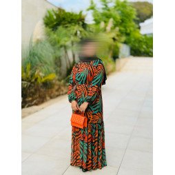 Affirmez votre style avec cette superbe robe longue à l’imprimé vibrant, mêlant des tons de vert feuillage, orange brûlé et noir profond. Son motif tropical façon zèbre revisité apporte une touche de caractère et de modernité, parfaite pour celles qui osent l’originalité avec raffinement.