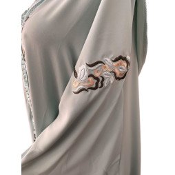 Découvrez l’élégance intemporelle de ce caftan marocain fluide, confectionné dans un tissu léger de couleur vert menthe. Sa coupe ample et confortable est sublimée par une broderie raffinée au niveau de la poitrine et des manches, mêlant des tons dorés, beige et noir pour un contraste subtil mais sophistiqué.