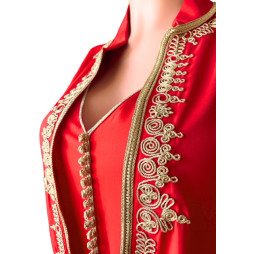 Plongez dans l'élégance royale avec cette jellaba rouge éclatante, sublimée par une sfifa et des broderies dorées réalisées avec finesse. Chaque détail est soigneusement travaillé à la main, révélant des motifs traditionnels marocains en fil torsadé qui longent l’encolure, la poitrine et les bords du vêtement. Le contraste saisissant entre le rouge vibrant et l’or lumineux confère à cette pièce une allure festive et raffinée.