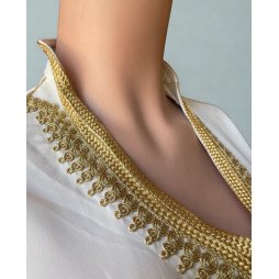 Apportez une touche de grâce et de pureté à votre garde-robe avec cette jellaba blanche en tissu fluide satiné, idéale pour les grandes occasions comme pour les moments de sérénité. Son design épuré est magnifié par des broderies dorées délicatement travaillées le long du col, de la poitrine et des poignets, évoquant la finesse du savoir-faire artisanal marocain.