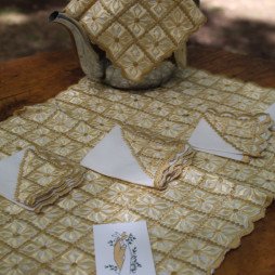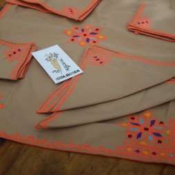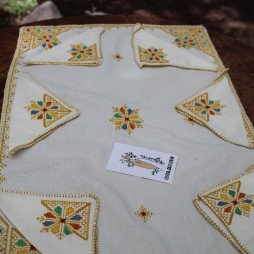 Élégant couvre-plateau brodé à la main en point Karwa, accompagné de 6 serviettes assorties. Une touche raffinée et authentique pour sublimer votre table.